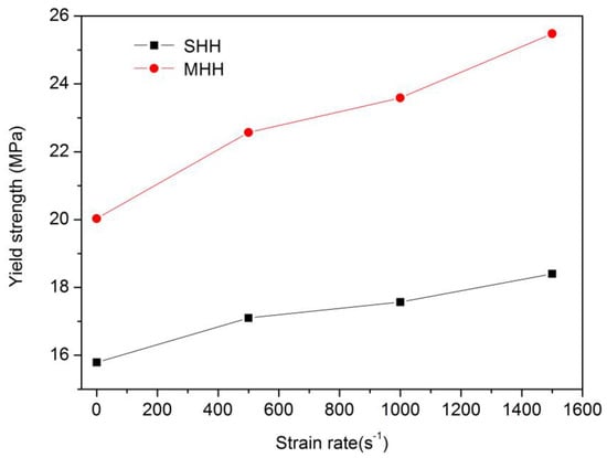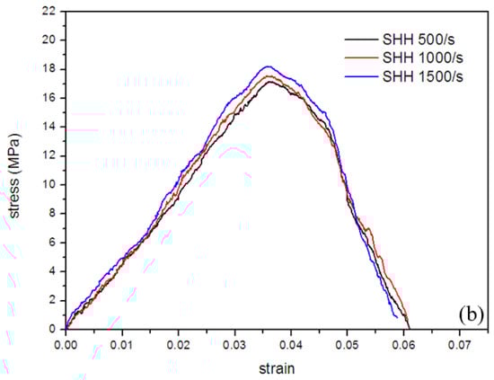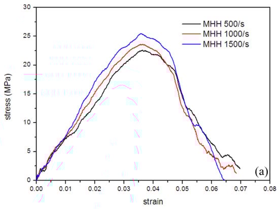 In the SHPB impact test, the bullet speed range is 2–6 m/s, and the corresponding load strain rate range is 500–1500 s−1. Figure 10a,b show the dynamic stress–strain curves of the two resin honeycomb materials with good repeatability under different strain rates. It can be seen from the figure that the dynamic stress–strain curve of the material is different from the quasi-static stress–strain curve. It has experienced an elastic stage before the stress reaches the initial peak, and then the stress begins to drop sharply due to the failure of the cell wall. All samples are compacted. Although the impact loading speed is low, due to the small size of the sample, the matrix resin material exhibits low toughness under dynamic loading, resulting that the dynamic stress–strain curve of the honeycomb specimens does not increase as the stress does under quasi-static loading. The platform stage is different from common metal porous materials. It can be seen from the figure that the two hierarchical materials of the unit cell size exhibit different strain rate sensitivity. Under the three strain rates studied, the stress–strain curve of the SHH material is basically similar, while the MHH material shows a certain strain rate sensitivity, and the collapse strength of the material increases at a high strain rate. Sahu [] and Onck [] pointed out that the larger the pore size of the foam material, the lower its strength. It can be seen from Figure 10 that although the MHH material has the same pore size as the SHH material, it has a lower relative density, and its collapse strength at different strain rates is higher than that of the SHH material. The above research shows that the reason for this difference may be related to the level number of honeycomb materials. The more levels honeycomb has, the higher the collapse strength.