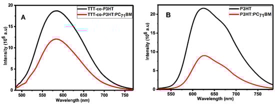 - Huang, P.-T.; Huang, P.-F.; Horng, Y.-J.; Yang, C.-P. Photoluminescence study on charge transfer behavior of Poly(3-hexylthiophene) and PCBM blends. J. Chin. Chem. Soc. 2013, 60, 467–472. [Google Scholar] [CrossRef]