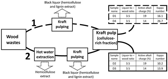 The kraft cooking of wood wastes was undertaken using a liquor-to-wood ratio of 3.5, at 160 °C for 60 min. The liquor consisted of an aqueous solution of sodium carbonate, sodium hydroxide and sodium sulfide, as reported elsewhere [17]. Two different alkaline charges, of 19 and 14%, were used in the cooking process to provide distinct degrees of delignification (kappa numbers). At the end of the cooking process, the obtained pulps were washed with water and then dried. The same kraft cooking procedures were also applied to the wood chips previously extracted with hot water. Kappa number of the final pulps was measured according to TAPPI Standard T236 om-99. The kraft pulps were analysed for sugar and lignin content. Klason and acid-soluble lignin were determined using the TAPPI Standards T 222 om and T UM 250, respectively, while the sugar content was determined in the hydrolysates using high-performance liquid chromatography (Knauer instrument, Berlin, Germany, with a Smartline pump 1000, Smartline RI Detector S2300, and an Agilent Hi-Plex Ca, 300 mm × 7.7 mm column from Agilent Technologies). It was expected that the two–step procedure (including the hot water extraction, see Figure 1) would lead to products of lower chemical complexity and higher cellulose content as compared to those obtained from the one-step procedure. This is confirmed by the results in Table 1.