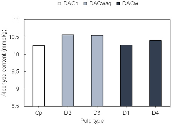 Influence of different lignin content of the raw materials on the aldehyde group content after the periodate oxidation. The reaction conditions were kept constant in all experiments at 75 °C and 3 h. DACp corresponds to dialdehyde cellulose obtained from bleached pulp, DACwaq to dialdehyde lignocellulose obtained from pulp prepared by hot water extraction/kraft cooking, and DACw corresponds to dialdehyde lignocellulose obtained from pulp submitted only to kraft cooking.