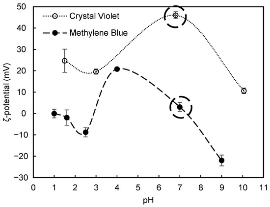 The large availability of different types of dyes and shades leads to large amounts of wastewaters which are extremely challenging to treat, due to the unique chemical structures of the dyes, with positively or negatively charged organic chromophores and relatively small molecular weight. In addition, it is important to bear in mind that changes in pH can lead to ionization of certain groups and therefore to a variation of the charge of the dye, depending on the pH range. The zeta potential of the tested dyes as a function of pH was determined experimentally and is shown in Figure 6, where the initial value for each dye is specifically highlighted. Both the zeta potential of Methylene Blue as well as that of Crystal Violet showed to be pH dependent. Different performances for the tested flocculants are then expected to be observed with the change of pH, when treating the model wastewaters containing these dyes.