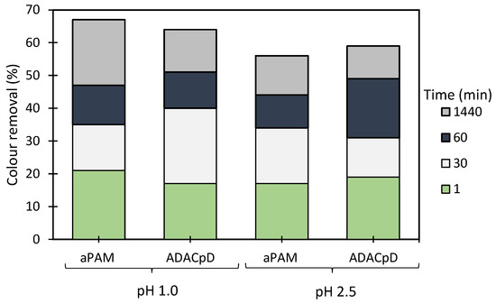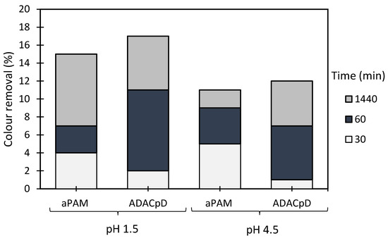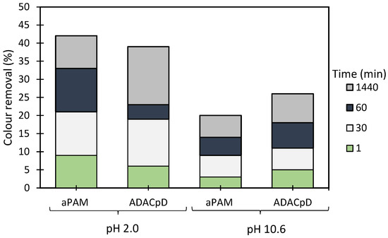 At pH 10.6, bentonite presents a negative surface charge [23], which was not completely neutralized by the positively charged dye molecules in this tested system. This resulted in less effective decolouration while using ADACs (anionic PEL) combined with bentonite, when compared with colour removals at pH 2.0, in particular at lower settling times. The reference aPAM presented worse decolouration results for higher pH values when compared to the tested anionic natural-based flocculants.