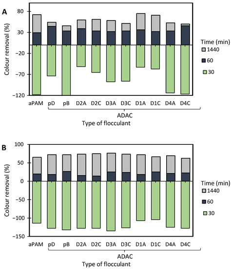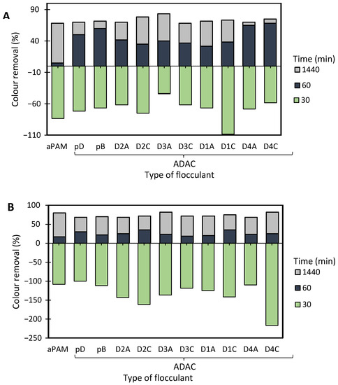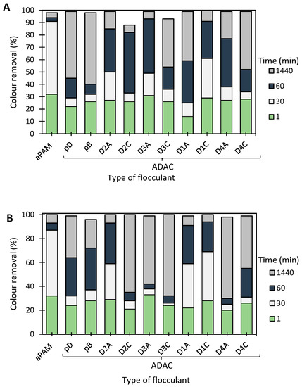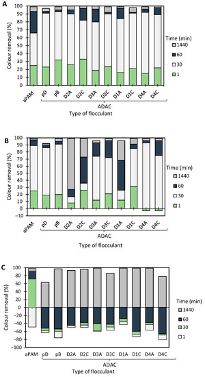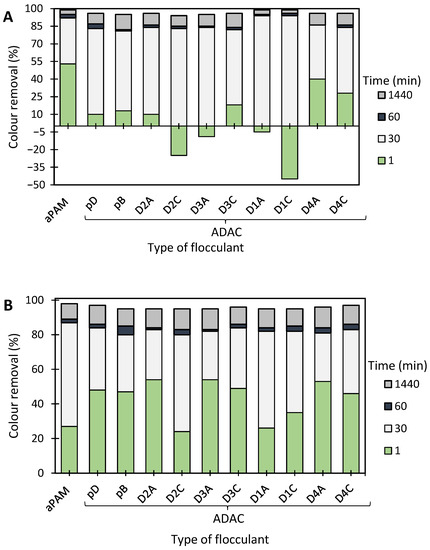 Figure 12, Figure A2 and Figure A3 show the results obtained at pH 2.0, 6.0 and 10.6, while using two different amounts of bentonite: 0.07 wt% (procedure A) or 0.14 wt% (procedure B), followed by the addition of 1.33 mg/L of the flocculation agent. Additionally, procedures A and B were compared with the treatment performed only with bentonite for the same amounts of this component (see Figure 13). In all the tests, colour removal increased with time, with the best results obtained at the end of the 24 h tests. Crystal Violet is positively charged for all pHs examined herein, however, at pH 6.0 (near the initial pH of the model system) the system showed to be the most stable (see Figure 6). At this particular pH, the tests showed the worst decolouration results (Figure A2), with null or very low colour removal (maximum 20%) being achieved. At the lowest pH, while applying dual systems, colour removal reached the highest values (removals between 91 and 100% after 24 h). Typically, as referred to previously, the addition of bentonite destabilises the dye-water system and addition of an anionic polymer allows bridging between bentonite-dye complexes, therefore flocs become larger, and faster settling over time occurs. Additionally, in the dual system flocculation with the ADACs at pH 2.0 (Figure 12), colour removal was already high (from 80 to 90%) after 30 min of treatment (procedures A, B), characteristic of an efficient flocculation. Furthermore, at this pH, increasing the amount of bentonite (compare A and B in Figure 12) did not lead to a significant increase in colour removal, except in the first minute of treatment. Performance of the ADACs was similar to that of the reference synthetic aPAM.