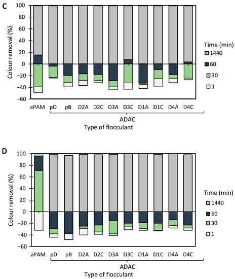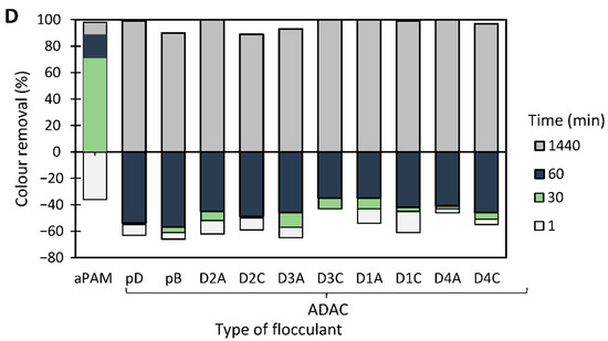 Analysing in more detail the results obtained for the dual systems (Figure 8 and Figure 9), similar good decolouration results could be obtained for pH 1.6 and 2.5, not only for the longest settling time (at 24 h of treatment), but also for intermediate settling times (compare Figure 8A,B and Figure 9A,B). However, flocculation was faster (higher removal after 30 min of treatment) when working at pH 2.5, using procedures A or B (0.07 wt% of bentonite followed by 1.33 mg/l of flocculant or 0.07 wt% of bentonite followed by 2.67 mg/l of flocculant, respectively), in particular in the case of procedure A. The influence of pH was more noticeable when a higher amount of bentonite was used, for which slightly lower removals were obtained at higher pH (compare Figure 8C,D and Figure 9C,D for pH 1.6 and 2.5, respectively). Additionally, increasing the amount of bentonite from 0.07 wt% to 0.14 wt%, did not improve decolouration. The procedure with 0.07 wt% of bentonite followed by 1.33 mg/L of ADAC provided good decolouration results, with no significant benefit appearing also from increasing the polymers concentration from 1.33 to 2.67 mg/l (compare A and B in Figure 8 or in Figure 9). When working at higher bentonite dosages, 0.14 wt% (see Figure 8C,D and Figure 9C,D) in dual system, for shorter contact times (up to 1 h) synthetic aPAM appeared to be more effective. However, after 24 h of settling both the synthetic and the cellulose-based flocculation agents showed very similar flocculation efficiency.