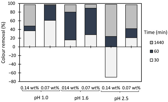 At the tested pHs (1.0 to 2.5) bentonite alone allowed good colour removal (see Figure 10), after 24 h, even if for pH 2.5 (the most interesting one) removal could be slightly lower when using bentonite alone rather than the dual system. Moreover, for this pH, and under the best conditions (0.07 wt% of bentonite), settling was slower when using bentonite alone rather than the dual system (compare Figure 9 A,B with Figure 10). Additionally, increasing the amount of bentonite, when used alone, was detrimental to colour removal kinetics (Figure 10).