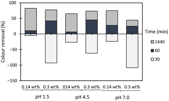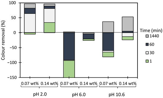 In all the presented tests, colour removal increased with time, thus largest colour removal was obtained at the end of the 24 h test. Although Methylene Blue is typically positively charged, for lower pH values (pH < 3) the dye is more unstable possessing a lower zeta potential (see Figure 6) and this was the reason for the selection of such low pH levels to perform this study. It was observed that at pH 2.5, while applying a dual system with bentonite followed by the anionic cellulose-based flocculants, almost full colour removal (≥99%) was obtained in most of the experiments, for the longest settling time (24 h).
