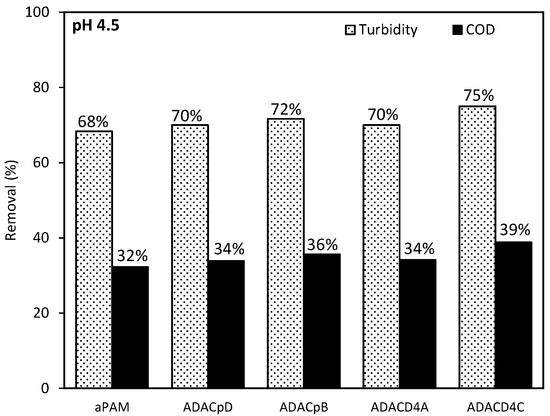 Anionic natural-based PELs, produced from bleached pulp, ADACpD, obtained after 24 h of sulfonation, and ADACpB obtained after 72 h of reaction, as well as anionic cellulose-based PELs obtained from pulp with the highest lignin content, ADACD4A (24 h of modification reaction) and ADACD4C (72 h of modification reaction), and the reference polymer aPAM, were tested also for COD reduction after 24 h of treatment. The conditions used for the COD measurements refer to the initial pH of 4.5, 0.3 wt% bentonite and the lower concentration of flocculant, corresponding to procedure A (0.3 wt% bentonite followed by 2.67 mg/L of flocculation agent), since this was the procedure which led to better results (see Figure 19). The COD reduction obtained with the tested new anionic bio-polyelectrolytes (ADACs) was poor, in the range of 34–39% (with turbidity reduction of 70–75% for these polymers and procedure), while with the synthetic reference performance in COD reduction was still lower, 32%. However, it is known that flocculation alone does not usually lead to high COD reductions when treating this type of industrial effluents [24].