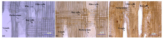 Wood treated with 10% and 30% furfuryl alcohol (FA) concentrations was investigated here because according to previous literature [40], no differences were seen in the locations of FA resin in wood anatomy when furfuryl alcohol content was more than 30%. Weight gain percent (WPG) of modified wood with 10% and 30% FA concentrations was 23% and 69%, respectively. Pore morphology of furfurylated wood with different WPG was shown in Figure 1. The colorless slice of poplar wood before treatment was made of tube-like vessels, thick-walled fibres and thin-walled ray cells (Figure 1a). Single vessels were linked by perforation plates, which transported fluid in vessels. One fiber cell was intercommunicated with the other fiber cell through pits. The slices of furfurylated wood with 23% and 69% WPG were reddish brown, which was attributed to distributions of colored FA resin in various cells (Figure 1b,c). The color of slices was aggravated with increasing WPG. As a result of the locations of FA resin characterized by reddish brown in tissues, it could be found that FA resin was distributed in fibres, vessels, ray cells and perforations. More importantly, a part of fiber lumina and perforations were blocked by FA resin. Pits of two furfurylated woods were not observed, which was likely attributed to pit occlusions. Cell walls of fibres became thicker and the color of the cell walls got deeper with increasing WPG, reflecting an enhancement of FA resin within cell walls with raising WPG. Thygesen et al., [31] showed that FA resin was distributed in cell walls, middle lamella, cell corners and lumina observed by confocal laser scanning microscopy. Briefly, furfurylation induced changes in pore structures, such as narrower lumina, pit occlusions and perforation occlusions. It was predictable that FA resin deposited into hierarchical pores made a contribution to the reduction of porosity.