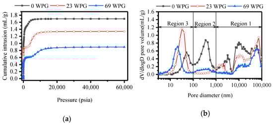 (a) Cumulative intrusion versus pressure (b) dV/dlogD pore volume versus pore size diameter in modified wood with different weight gain percent (WPG) (0%, 23% and 69%).