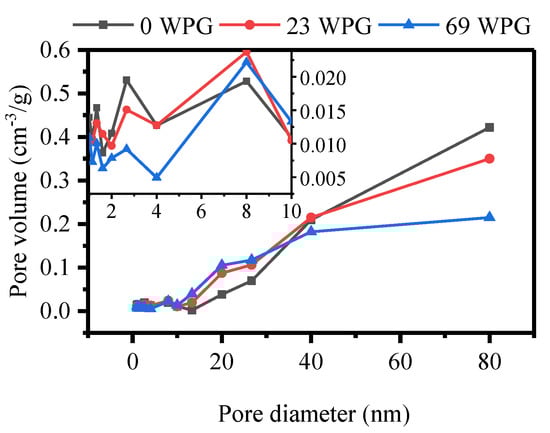 Pore volume versus pore size diameter in modified wood with different weight gain percent (WPG) (0%, 23% and 69%).