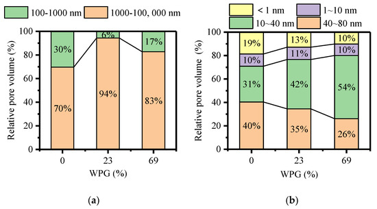 Relative pore volume of modified wood with different weight gain percent (WPG) (0%, 23% and 69%), (a) measured by MIP; (b) measured by NMR cryoporometry.