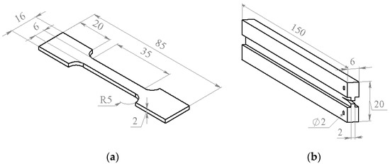 The specimens used for the tensile strength (a) and the crack resistance (b) measurements.