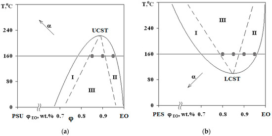 Interference patterns were analyzed using the standard technique [25]. The compositions of coexisting phases were determined and PDs were constructed at different stages of EO crosslinking. Phase inversion areas on the PD are indicated by the dashed lines on the basis of structural and morphological studies of cured compositions. Arrows (Figure 4) indicate the shift direction of critical point and binodal dome, which occurs due to the formation of spatial network of chemical bonds. It was established that an increase in the network density leads to a decrease in the solubility of components, an increase in UCST for PSU–EO systems and a decrease in the LCST for PES–EO systems. Compositions of coexisting phases change and the diffusion coefficient decreases due to the chemical reactions of crosslinking and network formation, which leads to the effect of concentration supersaturation, creating conditions for secondary phase structure formation.