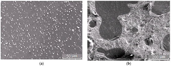 The SEM micrographs of phase structures of cured systems with UCST and LCST are represented in Figure 5, Figure 6, Figure 7, Figure 8 and Figure 9. All compositions have heterogeneous structures. Their specifics are manifested in various types of phase structure organizations, particle size distributions and presence of secondary phase transition particles.