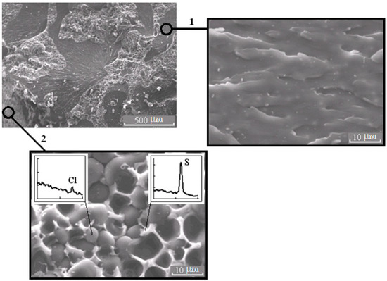 Morphology of the mixture PSU–EO at φPSU 10 wt.% with bicontinuous type of structure; 1 and 2 are regions enriched in epoxy polymer and TP, respectively. On the inserts, fragments of the X-ray spectra of microphases are represented.