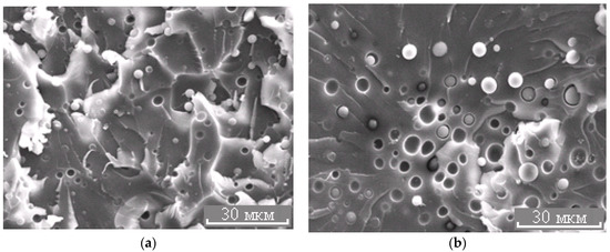 Figure 12 shows that modification of systems with PSU induces changes in the elastic modulus and tensile strength within the error range, when there is a decrease in tensile strength by two times in the area of phase inversion (φPES 15 and 20 wt.%) for systems with PES. An increase in the size of PES-rich dispersed phase leads to a 25% increase in the modulus of elasticity. This effect is not observed for systems with PSU. Growth of elastic modulus of compositions modified with PES at concentrations up to 10 wt.% is due to a formation of heterogeneous dispersion of larger particles in the structure. It is important that, at low modifier concentrations, the dispersed phase is enriched with TP with a higher Tg (240 °C), and hence higher elastic modulus, than the cured EO, whose Tg is comparable to the curing temperature (160 °C). The tensile strength loss occurring in EO–PES systems (φPES 15 and 20 wt.%) with “salami” type structures is associated with a phase composition change (Δφ) resulting from the composition being cooled to room temperature (Figure 11).