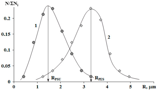 Size distribution of phases in the cured mixtures PSU–EO (1) and PES–EO (2) with 5 wt.% of TP. RPSU and RPES are the average sizes of heterogeneous particles in the PSU–EO and PES–EO systems, respectively.