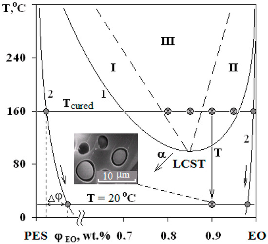 Evolution of the PD of the PES–EO system during the curing reaction. The arrow α indicates the direction of the critical temperature shift with increasing α. Other arrows indicate the change in the composition of the phases with decreasing temperature of the cured system. Δφ is the composition shift of the dispersed phase in the cured mixture at room temperature. The micrograph shows the phase structure of the mixture at 10 wt.% of PES.
