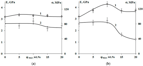 Concentration dependences of the elastic modulus (1) and tensile strength (2) of cured epoxy–TP compositions modified with PSU (a) and PES (b). Temperature −20 °C.
