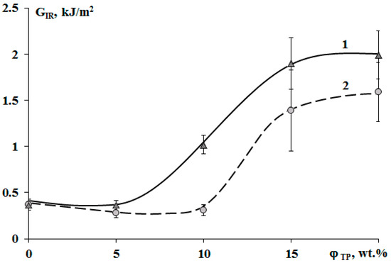 Concentration dependences of crack resistance (GIR) of cured epoxy–TP compositions modified with PSU (1) and PES (2).