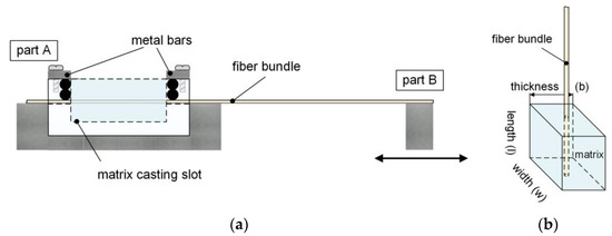 In this work, FBPO specimens were prepared for the analysis on tailored fiber–matrix bonding. The modified FBPO test benefits from a fast, easy and economic test condition with a more realistic failure mechanism e.g., statistical filament–matrix distribution, fiber–fiber friction or a more realistic interfacial shear strength distribution. The verification of this presented test setup was described and investigated in detail in another study focusing on a modified FBPO method for the characterization of fiber-reinforced hyperelastic elastomers [35]. For this purpose, a novel specimen manufacturing tool [35] was designed, which had to fulfill the main requirements of (i) an exact fiber bundle positioning in the center of the surrounding matrix material to avoid negative effects caused by tilting or asymmetrical stress distributions along the specimen thickness; (ii) fixing of the fiber bundles, avoiding any pre-damage; (iii) straight placing of the fiber bundle without generating tensile stresses; and (iv) good sealing, especially in the transition region between the embedded and non-embedded fiber bundle due to creep and adhesion forces in fiber bundle direction causing impaired data recording and errors in the results. The handling and assembly design with the main components are schematically illustrated in Figure 1a. Generally, the tool consists of two parts, where part A contains a corpus with narrow slots for the bundles with a defined recess for the cast matrix system. Subsequently, seals have to be implemented on both sides next to the recess to ensure an exact fiber positioning as well as leakage prevention due to the impregnation process. Part B is designed in a movable way with the purpose of aligning the placed fiber bundles in a straight manner. Regarding the surrounding matrix part, all specimens have the exact same geometry with a width w of 10 mm, a thickness b of 8 mm and a length l of 10 mm, where l is equal with the embedded length le for the impregnated fiber bundle part (see Figure 1b). Regarding the sample preparation of the FBPO samples, after the casting step of the non-crosslinked prepolymer, the same manufacturing concept was implemented as before, producing the pure elastomeric matrix materials.