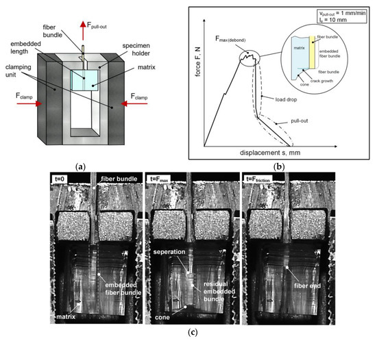 Flexible composites combine reinforcing fibers with elastomeric matrix resulting in good mechanical properties and stability but still maintain a flexible structure. Completely new applications for those advanced composite material classes considering supplementary biomimetic approaches [1] could be found, e.g., in the field of medical engineering to generate artificial muscles [2], exoskeletons for rehabilitation [3] or aeroelastic skin-like wings [4,5]. To ensure sufficient mechanical performance for these materials and to avoid unwanted stress concentrations [6,7], efficient load transfer between fibers and the matrix [8] as well as excellent fiber–matrix adhesion are required [9,10]. Thus, in-depth knowledge and quantitative investigations of the interface properties [11,12] are essential, which are resulting from the decisive impact due to targeted surface modifications [10] but also from the characteristics of the combined individual components themselves [13,14]. Test methods to study the fiber–matrix interface have been designed for the single fiber (micro scale), fiber bundle (meso scale) and laminate level (macro scale). The single-fiber- and fiber-bundle-level tests provide data that are well related to the interfacial properties [10,11,12,15,16], whereas the data obtained from the laminate level testing are sensitive, e.g., to fiber directions [17] and other laminate processing-related factors [8,18]. To ensure sufficient performance at component level, which is known to consist of a large number of threads and therefore includes numerous boundary conditions [19], it is important to investigate the material behavior at bundle level as a representative volume unit and to define the global structural behavior accordingly [20,21]. In relation to this, a direct correlation between the micro and meso scale tests with the macroscopic composite parts is not feasible [8,22]. The considered methods to investigate the interface properties for composites are mainly carried out with single fiber or fiber bundle tests like the well-known single-fiber push-out test [23,24], single-fiber pull-out test [25,26] and fiber bundle pull-out (FBPO) test [15,27]. Nevertheless, there is still no consistent design or standardization for the interface characterization, and, therefore, comparability between various test setups is only possible within a limited range. Hence, the essential material data obtained from these tests need to be validated [10,14].