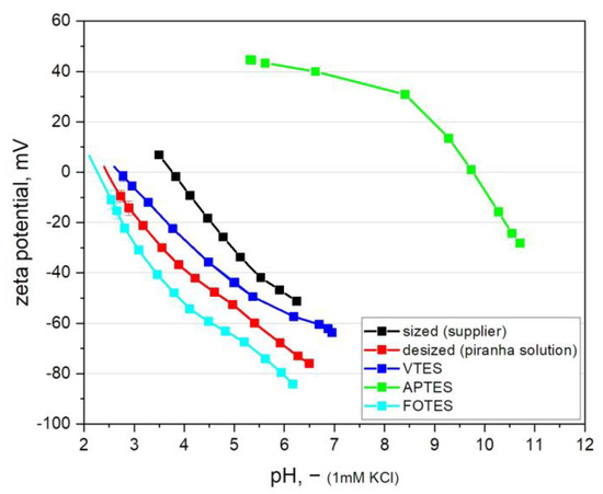 Zeta potential measurements were carried out to investigate the change in the surface charges of GF prior to and after the modification procedure (see Figure 3). Commercially available fibers were used with a proprietary sizing, which was removed by a treatment with acidic and basic piranha solution. The results reveal an isoelectric point (IEP) of the GF with the treatment from supplier (prior the desizing step) of about 3.8, indicating the presence of weak basic groups [62]. After the desizing and activation of GF with acidic and basic piranha solution, the IEP shifts to a lower value of about 2.4 [37]. This can be explained by the presence of a high number of acidic silanol moieties of the inorganic GF, which become dominant after the successful removal of the organic sizing during the acidic and basic piranha treatment. Along with the removal of the sizing, the silanol groups were activated on the surface for the subsequent immobilization of the organo-silanes [63]. Figure 3 shows negative zeta potential values, which are characteristic for GF surfaces, since the acidic groups on the surface are fully separated in the basic pH range, resulting in negative potential surface charges [64,65].