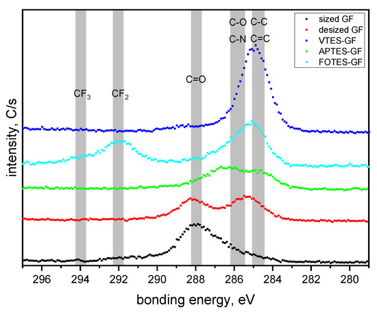 The GF sized by the supplier shows two components of the C 1s spectrum related to C–O at 286.2 eV and C=O at 288.0 eV. After the acidic and basic piranha treatment, both characteristic signals for CO2 impurities could be observed at 285.5 and 288.1 eV (C–O to C=O ratio of 1 to 0.9). The results confirm that the carbon signal detected in the desized GF is indeed from physisorbed CO2 and not related to residues of the organic sizing. The attachment of VTES is associated with an increase in the carbon content on the surface as reported in Table 2, which can be explained by the C–C and C=C bonds (285.0 eV) present in the structure of the organo-silane. In contrast, the APTES-modified GF comprise some CO2 impurities and additional signals for C–C bond at 284.6 eV and C–N bond, which was overlapping with the signal for the C–O bond at 286.4 eV [72,74]. For the FOTES modified GF, the results revealed two characteristic signals for the CF2 group at 292.0 eV and the CF3 group at 294.1 eV [73].