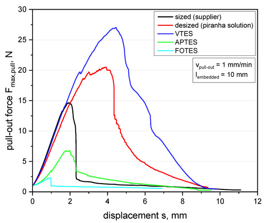 Concerning the pull-out behavior of modified fiber–matrix interfaces versus the maximum bearable load Fmax,pull, the results of GF incorporated within a PDMS matrix are graphically compared in Figure 5. As expected, the attached functional groups of FOTES gave the lowest adhesion strength with a maximum force of about 2.5 N due to the hydrophobic nature of perfluorinated surfaces and absence of any chemical interactions (e.g., covalent bonds, H-bonds or ionic interactions). Thus, fiber–matrix interactions were successfully impaired and further physical or other chemical bonding reactions were considerably hindered [67]. The treatment with APTES reveals a clearly lower maximum pull-out forces of about 6.7 N compared to the commercially sized fibers from the supplier with a Fmax,pull of about 14.5 N. This can be explained by the weaker bonding energy of amino groups with the PDMS matrix, and, therefore, this leads to less compatibility, especially in the fiber–matrix interaction [70], which can be clearly observed in Figure 5. However, it can be seen that the removal of the commercial sizing with piranha solution improves the fiber–matrix interface performance significantly, and the maximum pull-out force Fmax,pull amounts to 20.5 N (approximately 40%) compared to commercial sized fibers. We assume that this improved adhesion performance is related to the presence of ketone groups from the oxidized sizing residues, which are known to undergo catalyzed hydrosilylation with Si-H bonds [75]. Thus, a direct coupling of the oxidized residues of the sizing with the PDMS matrix (which is a two-component system containing activated Si–H) is obtained, leading to an enhanced pull-out force. In relation to this, the results for VTES-treated GF reveal the highest adhesion strength between the fiber bundles and the surrounding matrix, indicated by the high required maximum pull-out force of about 27.1 N (approximately 85%) compared to commercially available sized fibers from the supplier. During the hydrosilylation process of the PDMS with the vinyl-terminated silanes, the modified glass fiber surface via VTES additionally reacts with the methylhydrosilane groups of the crosslinker, which leads to good covalent bonding between the GF and the PDMS matrix [58]. This effect can be enhanced by using higher processing temperatures during the sample manufacturing process of about 70 °C, where the bonding of the vinyl groups during the curing steps via platinum catalyst co-reacts and can be proceed more easily. It is evident that results of the FBPO test with the commercial sizing from the supplier reveal an intermediate position compared with all other treated GF-PDMS samples. A reason for this is that those sizings are usually a mixture of various chemicals typically for a broader range of composite application with emphasis on different specifications, such as the economical aspect for large production units, mostly thermoset-based products and medium adhesion to different resin systems [37]. In general, a direct correlation between the tailored silane-treated fibers and the fibers with a commercial sizing should be considered carefully, since the commercial fibers may also contain film-building agents and other components that are responsible for a homogeneous wetting of the fiber surface. Therefore, additional mixed interactions occur, since the influence of chemical interactions due to covalent bonds as well as physical effects, such as polar or non-polar effects or adhesive interactions, are involved.