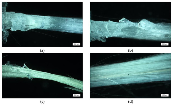 Besides the results obtained from the FBPO test, the accompanying optical damage analysis provides further information about the pull-out performance and fracture surfaces, which show good agreement with both analysis methods, the zeta potential and FBPO tests. As illustrated in Figure 6a, the optimized interface adhesion of VTES-modified fibers corresponds to the resulting damage surface. It is evident that the complete GF bundle is encapsulated with PDMS, which indicates that the adhesive fiber–matrix bonding is higher than the strength of the matrix. The resulting fracture surface is located near the interface inside the pure PDMS, where the stress concentration of the already deformed elastomer is maximized. Moreover, this effect can be further obtained for desized GF, revealing an adequate fiber–matrix adhesion due to the formed covalent bonds between GF and siloxane monomers of PDMS, which is visible in Figure 6b. In contrast to this, PDMS residues can be barely depicted on the fracture surface of APTES modified GF. This can be explained by the high surface polarity of the amino groups compared to hydrophobic PDMS matrix leading to lower chemical interactions between the treated GF with PDMS (see Figure 6c). Figure 6d shows an example of an original GF bundle (before PDMS wetting) and with the corresponding surface sizing from the supplier.