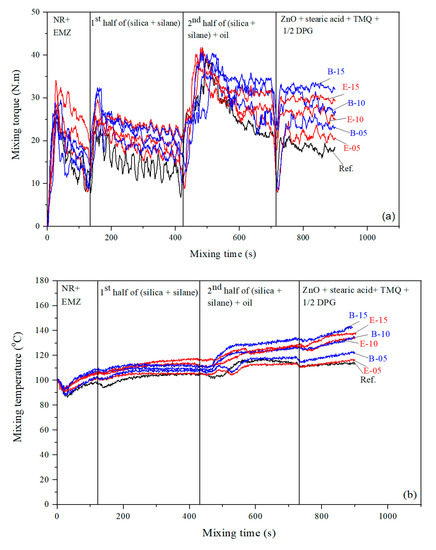 Mixing fingerprints based on (a) torque and (b) temperature of silica-filled NR compounds with various EMZ contents added via either extra addition (E05-E15) or blending (B05-B15).