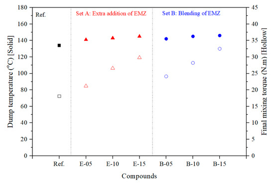 Dump temperatures and final mixing torques of the silica-filled NR compounds as a function of EMZ content added via either extra addition (Set A) or blending (Set B).