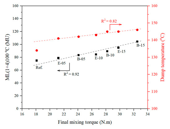 Correlations among final mixing torques, dump temperatures, and Mooney viscosities of silica-filled NR compounds with different amounts of EMZ added via either extra addition (E05–E15) or blending (B05–B15).