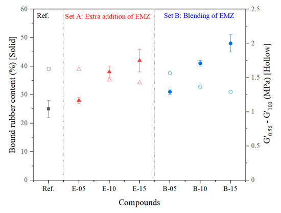 Influence of EMZ content on chemically bound rubber contents and Payne effect of silica-filled NR compounds. EMZ was added via either extra addition (Set A) or blending (Set B).