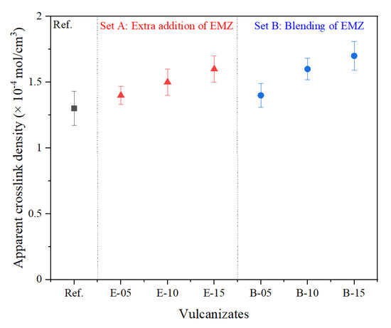 Effect of EMZ contents on the apparent crosslink density of silica-filled NR vulcanizates. EMZ was added via either extra addition (Set A) or blending (Set B).