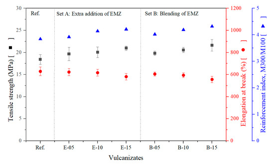 Effect of EMZ content on tensile strength, elongation at break, and reinforcement index of silica-filled NR vulcanizates. EMZ was added via either extra addition (Set A) or blending (Set B).