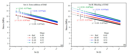 Stress relaxation curves as a function of EMZ loading levels of silica-filled NR vulcanizates. EMZ was added via either extra addition (Set A) or blending (Set B).