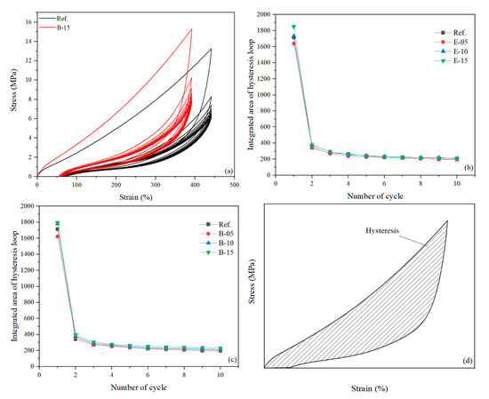 (a) Stress–strain curves of the reference sample (Ref.) and B-15 vulcanizate under a cyclic tensile deformation for 10 cycles. Integral area of hysteresis loop as a function of cycle number of the vulcanizates from (b) Set A, with extra addition of EMZ, and (c) Set B, with blending of EMZ. (d) Schematic illustration of how to calculate the values of hysteresis from the loading and unloading stress–strain curves.