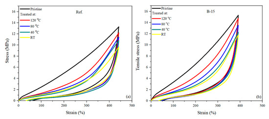 Examples of stress–strain cyclic curves of (a) the reference and (b) B-15 vulcanizates from the first cycle of a cyclic tensile test. The pristine sample of each vulcanizate after its first-round test was thermally treated at different temperatures prior to the repetition of the stress–strain cyclic test.