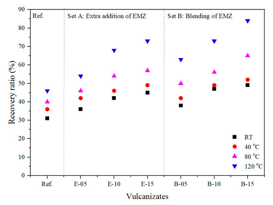 Recovery of the hysteresis after a tensile cyclic test (10 cycles) of silica-filled NR vulcanizates with different contents of EMZ modifier added via either extra addition (Set A) or blending (Set B).