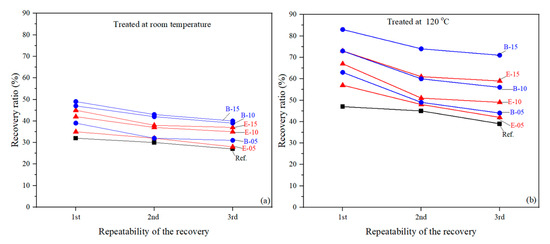 The recovery ratio of silica-filled NR vulcanizates with different EMZ loading levels treated at (a) room temperature and (b) 120 °C for three rounds of the cyclic test.