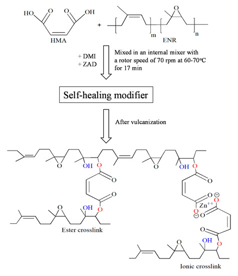 Preparation of the self-healing modifier used in this study and the possible ester and ionic crosslink structures generated through the hydrolyzed maleic anhydride after the modifier underwent a vulcanization process [14,15].