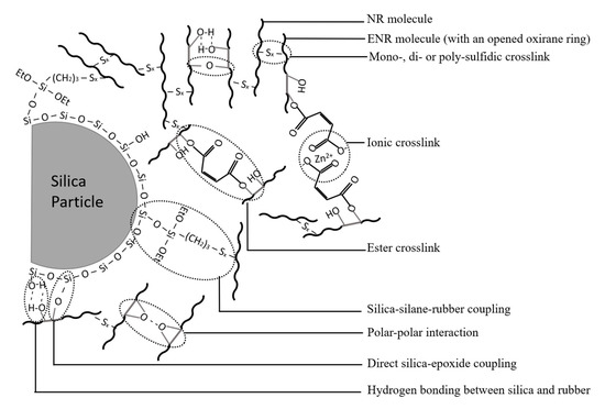 - Manna, A.K.; De, P.P.; Tripathy, D.K.; De, S.K.; Peiffer, D.G. Bonding between precipitated silica and epoxidized natural rubber in the presence of silane coupling agent. J. Appl. Polym. Sci. 1999, 74, 389–398. [Google Scholar] [CrossRef]