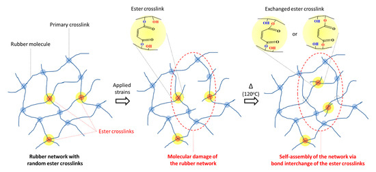 Plausible self-reparation mechanism of molecular damages of rubber network through the transesterification reaction of the thermochemically exchangeable ester crosslinks.