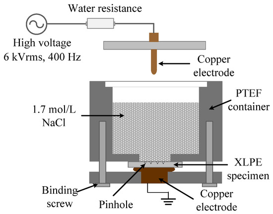 Figure 2 shows a schematic of the accelerated water tree aging experimental setup recommended by IEC/TS 61956. NaCl solution was used at a concentration of 1.7 mol/L. A 6 kV rms voltage with a frequency of 400 Hz was applied to the NaCl solution through an upper copper electrode in contact with the solution. The XLPE specimen was fixed on the bottom of the container to ensure the aging area was completely immersed in the solution. The bottom copper electrode was grounded. A controlled oven and a controlled freezer (both are manufactured by Beijing Surui electronic equipment Co., Ltd, Beijing, China) were used for water tree aging at different temperatures. Four specimens of each group were exposed to isothermal environments at −15 °C, 0 °C, 20 °C, 40 °C, 60 °C, and 80 °C, respectively.