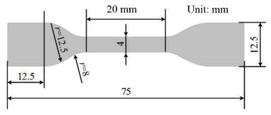 To investigate the mechanical strength of the material, according to the method in a standard (GB/T 1040-2006, tensile strength test of plastics), a tensile test was also performed. The tensile testing machine JDL-5000N (manufactured by Ji’nan Chuanbai equipment Co., Ltd, Ji’nan, China) was used in the test. Twenty-five dumbbell-shaped specimens with 75 mm in length were produced for the tensile test, with an average thickness of (1 ± 0.2) mm. Figure 3 shows the configuration of each dumbbell-shaped specimen. Five specimens from each group were exposed to isothermal environments at 0 °C, 20 °C, 40 °C, 60 °C, and 80 °C, respectively. The tension was always applied to the specimens until the break of specimens with a stretching rate of 250 mm/min.