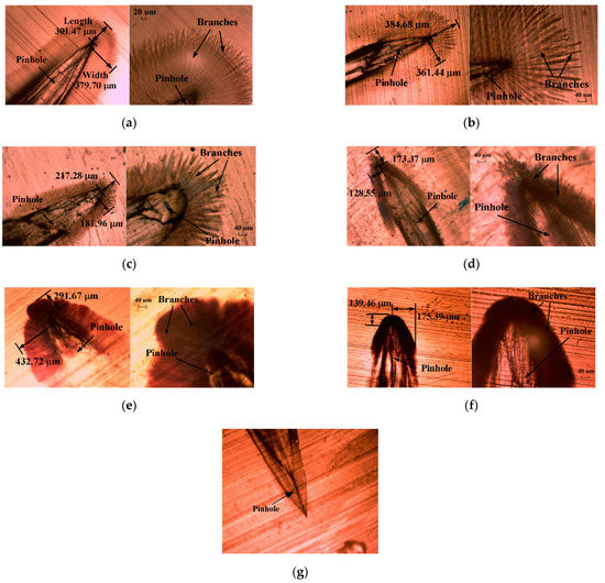 Water tree morphologies at different temperatures after 22 days of aging (24 h per day): (a) −15 °C; (b) 0 °C; (c) 20 °C; (d) 40 °C; (e) 60 °C; (f) 80 °C (×64 and ×160 magnifications); (g) pinhole without water tree aging.