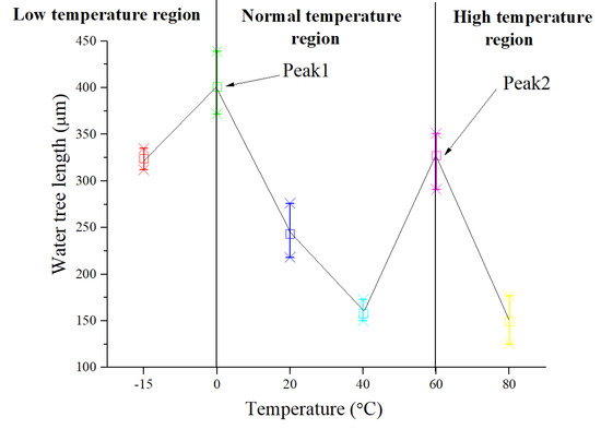 According to the results in Figure 5, the length of the water tree does not always increase or decrease with the rise in temperature, and it presents nonlinear changes. Due to the changes being possibly related to the mechanical properties of the material which are being affected by the molecular thermal motion at different temperatures, in the next section, the relationship between them will be discussed in detail. The trend curve of water tree length in Figure 5 was separated into three regions: low-temperature region (below 0 °C), normal temperature region (0–60 °C), and high-temperature region (above 60 °C). In each region, the water tree length exhibits different trends. Below 0 °C, with the decrease in temperature, water tree length decreases. In the normal temperature region, water tree length presents a trend in the form of firstly increase and then decrease. Above 60 °C, water tree length reduces with the rise in temperature. There are two peaks of water tree length at 0 °C (Peak 1) and at 60 °C (Peak 2). This implies a transition temperature around 0 °C and 60 °C, at which the water tree propagation mechanism can change. As a result, in the next section, water tree propagation behaviors in the three temperature regions were discussed, as shown in Figure 5.