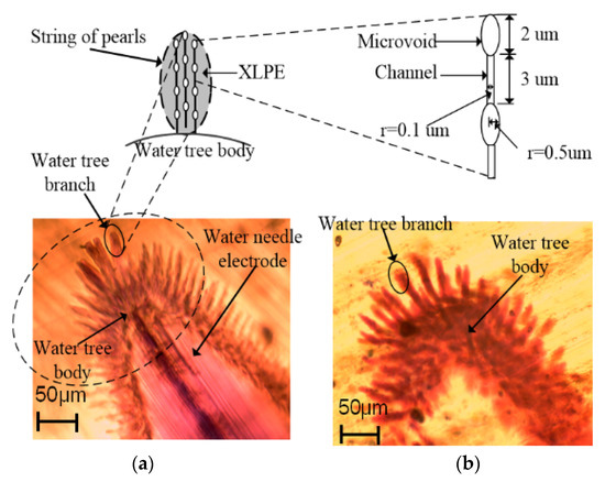 Based on the water tree morphologies in the early period observed in Figure 8, a water tree includes a water tree body and some forked branches. Generally, water tree branches consist of water-filled voids and channels to form the “string of pearls” model [27]. The water-filled microvoids can be several microns in radius, and the channels are several to tens of microns in length and tens of nanometers in width. Due to the width of branches, as shown in Figure 8a, reaching about 10 micrometers, the larger water tree branches can include a few small branches [32]. Each small water tree branch includes the elliptic voids with a major axis of 2 μm and a minor axis of 1 μm, and the channels with 3 μm in length and 100 nanometers in width [32].