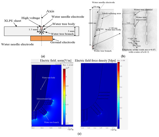 The water tree model in a sheet specimen for electric field calculation: (a) Specimen and water tree model; (b) Water tree main body, water tree channel, and water-filled voids; (c) Electric field distribution and electric field force density of water tree.